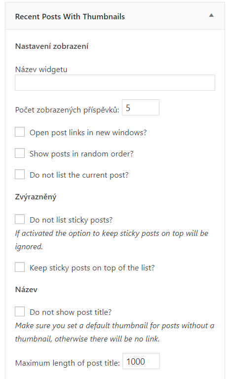 Nový widget se jmenuje Recent Posts Widget With Thumbnails a obsahuje následující nastavení: