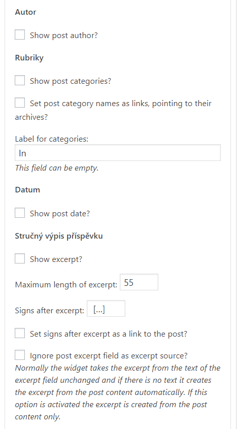 • Ignore post excerpt field as excerpt source? – ignorovat pole Stručný výpis příspěvků jako zdroj.